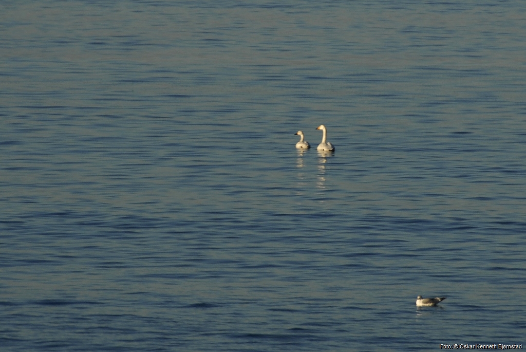 Dvergsvane på Karmøy Det er sjelden det er dvergsvaner på besøk på Karmøy. Denne gangen var det på Stavasanden den ble sett sammen med en sangsvane. Dvergsvane på Stavasanden Av Oskar Kenneth Bjørnstad 26.12.2010 kl. 19:09 I dag 26.desember 2010 ble det funnet en dvergsvane på Stavasanden på Karmøy. Denne var sammen med en sangsvane og dermed var det enkelt å se den store forskjellen det egentlig er på disse. Sangsvanen er en god del større og har mye mere gult på nebbet. Det var stille og sol, men litt frostrøyk utover sjøen og de holdt seg nok så langt ute. Derfor ble det ikke lett å få bilder av dem. Det er ikke så ofte en ser dvergsvaner på Karmøy, faktisk så sjeldent at undertegnede aldri har sett dem på Karmøy før. |